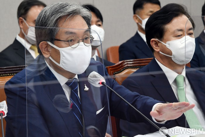 [서울=뉴스핌] 최상수 기자 = 노영민(왼쪽) 대통령비서실장이 2일 국회에서 열린 운영위원회 전체회의서 질의에 답하고 있다.오른쪽은 김영춘 국회사무총장. 2020.09.02 kilroy023@newspim.com