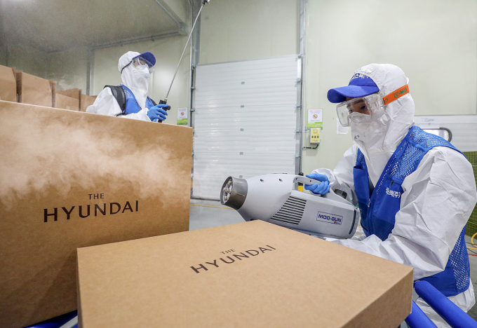 | 경기도 김포시에 위치한 물류센터에서 전문 방역업체 직원들이 초미립자 분사기를 활용해 선물세트를 소독하고 있다. [사진=현대백화점] 2020.09.03 nrd8120@newspim.com |