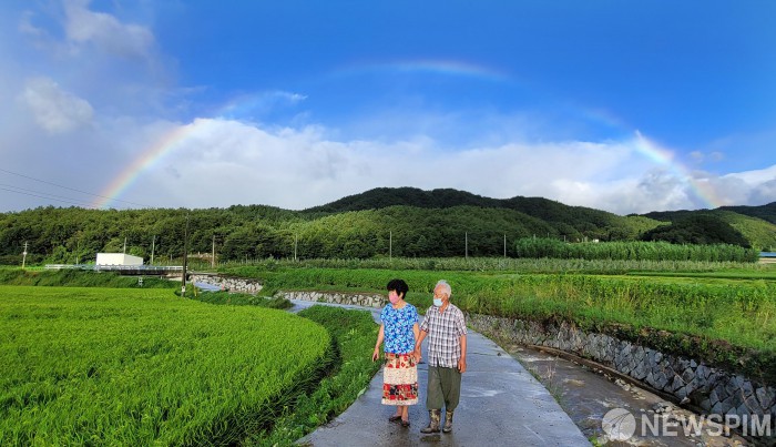 [함양=뉴스핌] 정철윤 기자 = 제9호 태풍 '마이삭'이 지나간 3일 오전 경남 함양군 수동면 도북마을 하늘에 펼쳐진 무지개 아래를 노부부가 걸어가고 있다.2020.09.03 yun0114@newspim.com