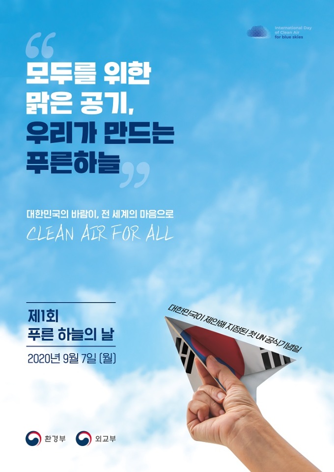 3일 대기환경청에 따르면 '푸른 하늘의 날'은 문재인 대통령이 지난해 9월 유엔기후행동정상회의에서 세계 푸른하늘의 날 지정을 제안했으며 이후 같은 해 12월 유엔 총회에서 매년 9월 7일을 유엔 공식 기념일인 '푸른하늘을 위한 국제 맑은 공기의 날'로 채택해 올해 처음 기념일로 지켜진다.