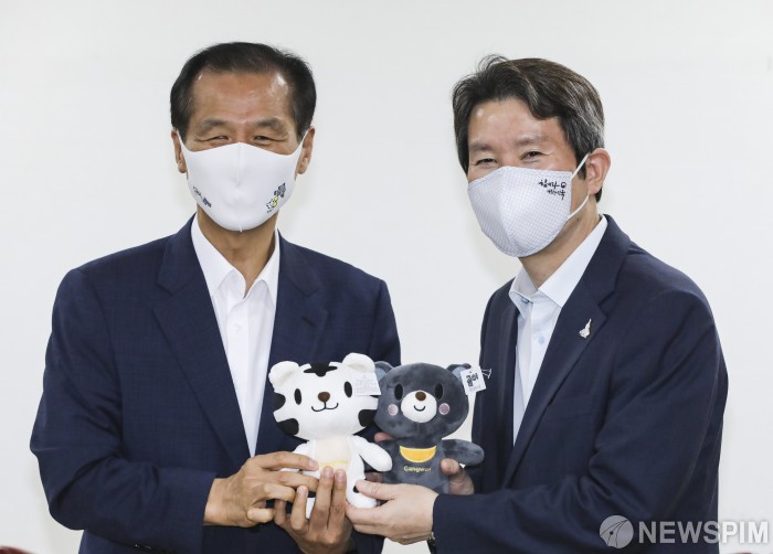 [서울=뉴스핌] 이한결 기자 = 이인영 통일부 장관(오른쪽)이 4일 오전 서울 종로구 정부서울청사 통일부 장관실에서 최문순 강원도지사와 함께 강원도 대표 캐릭터인 범이-곰이 인형을 든 채 기념촬영을 하고 있다. 2020.09.04 alwaysame@newspim.com