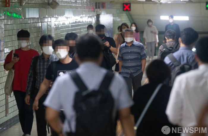 [서울=뉴스핌] 윤창빈 기자 = 수도권 사회적 거리두기 2.5단계가 1주일 연장된 7일 오전 서울 동대문구 신설동역의 시민들이 출근길을 서두르고 있다. 2020.09.07 pangbin@newspim.com