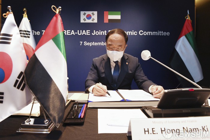 [서울=뉴스핌] 홍남기 부총리 겸 기획재정부 장관이 7일 오후 서울 광화문 포시즌스호텔에서 압둘라 빈 투크 알 마리 UAE 경제부 장관과 '제7차 한-UAE 경제공동위원회' 화상회의에서 합의의사록에 서명하고 있다. [사진=기획재정부] 2020.09.08 photo@newspim.com