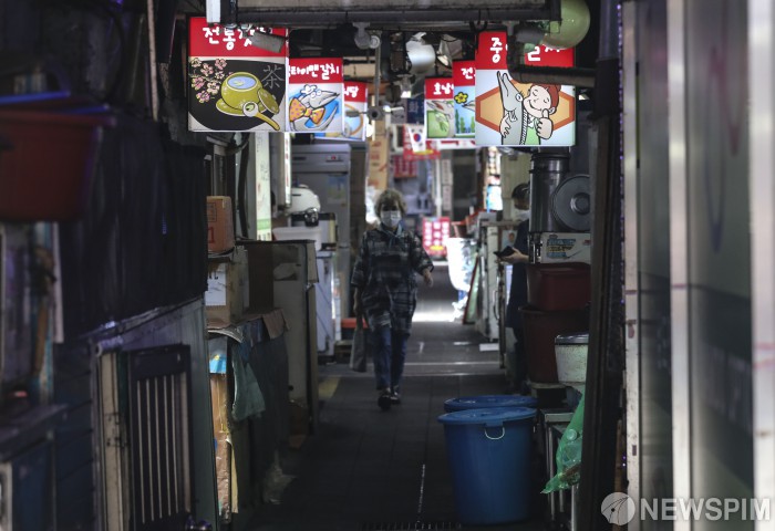 [서울=뉴스핌] 이한결 기자 = 연장된 사회적 거리두기 2.5단계가 시행되고 있는 9일 오후 서울 중구 남대문시장의 갈치골목이 한산하다. 이날 0시 기준 신규 코로나19 확진자는 156명으로 일주일째 100명대를 유지하고 있다. 2020.09.09 alwaysame@newspim.com