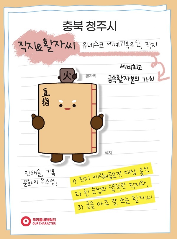 [청주=뉴스핌] 박상연 기자 = 청주시는 직지 캐릭터 '직지와 활자씨'가 문화체육관광부와 한국콘텐츠진흥원이 주최하는 '제3회 우리동네 캐릭터 대상 공모전-지역 부문'에 참가해 본선에 진출하는 쾌거를 이뤘다고 16일 밝혔다.
