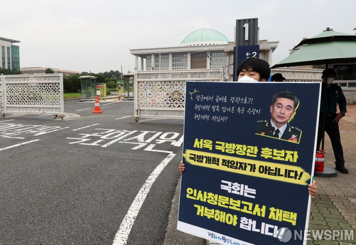 [서울=뉴스핌] 정일구 기자 = 평화와통일을여는사람들 소속 회원이 16일 오전 서울 여의도 국회 앞에서 서욱 국방부 장관 후보자 인사청문보고서 채택 거부 촉구 1인 시위를 하고 있다. 2020.09.16 mironj19@newspim.com
