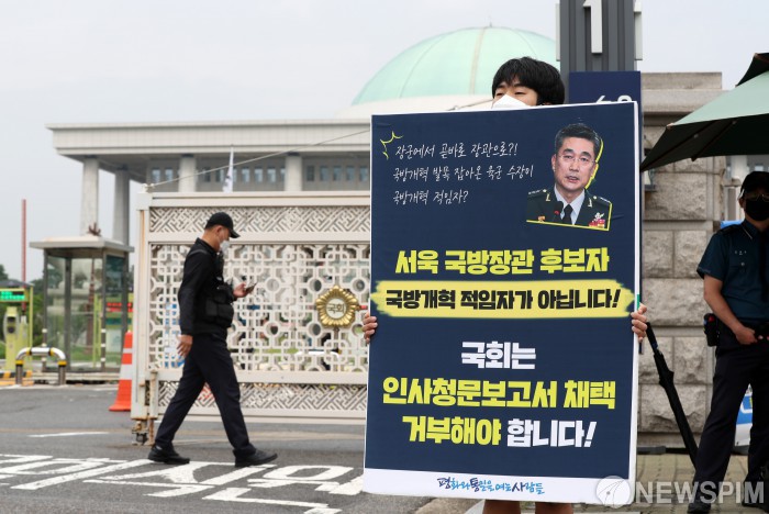 [서울=뉴스핌] 정일구 기자 = 평화와통일을여는사람들 소속 회원이 16일 오전 서울 여의도 국회 앞에서 서욱 국방부 장관 후보자 인사청문보고서 채택 거부 촉구 1인 시위를 하고 있다. 2020.09.16 mironj19@newspim.com