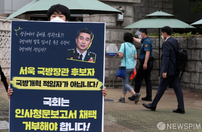 [서울=뉴스핌] 정일구 기자 = 평화와통일을여는사람들 소속 회원이 16일 오전 서울 여의도 국회 앞에서 서욱 국방부 장관 후보자 인사청문보고서 채택 거부 촉구 1인 시위를 하고 있다. 2020.09.16 mironj19@newspim.com