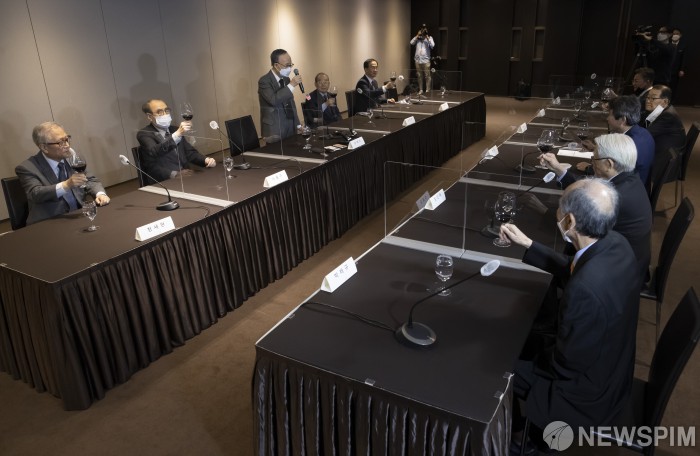 [서울=뉴스핌] 이형석 기자 = 손재식 전 장관이 17일 오후 서울 중구 더플라자호텔에서 열린 전직 통일부장관 초청 간담회에서 건배사를 하고 있다. 2020.09.17 leehs@newspim.com