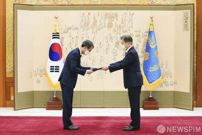 [서울=뉴스핌]문재인 대통령이 18일 오후 청와대에서 이흥구 신임 대법관에게 임명장을 수여하고 있다.[사진=청와대] 2020.09.18 photo@newspim.com