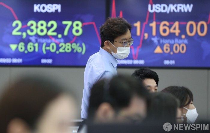 [서울=뉴스핌] 김학선 기자 = 22일 코스피 지수는 1.25p(0.05%) 오른 2388.14에 출발해 거래를 이어가고 있다. 원달러 환율은 5.9원 오른 1163.9원에 거래를 시작했으며 코스닥 지수는 0.73p(0.08%) 오른 867.72에 개장했다. 이날 오전 서울 중구 하나은행 딜링룸에서 딜러들이 업무를 보고 있다. 2020.09.22 yooksa@newspim.com