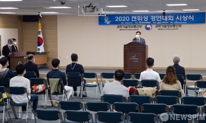 [세종=뉴스핌] 정병선 과학기술정보통신부 제1차관이 22일 오전 세종특별자치시 세종파이낸스센터 과기정통부 대강당에서 열린 '2020 캔위성 경연대회 시상식'에서 축사를 하고 있다. [사진=과학기술정보통신부 ] 2020.09.22 photo@newspim.com