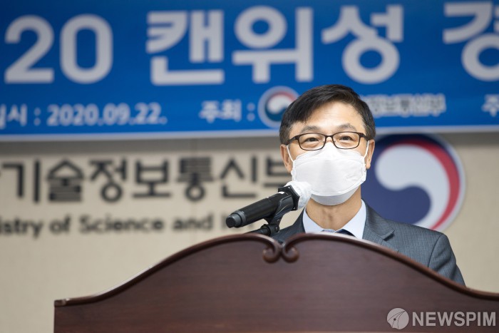 [세종=뉴스핌] 정병선 과학기술정보통신부 제1차관이 22일 오전 세종특별자치시 세종파이낸스센터 과기정통부 대강당에서 열린 '2020 캔위성 경연대회 시상식'에서 축사를 하고 있다. [사진=과학기술정보통신부 ] 2020.09.22 photo@newspim.com