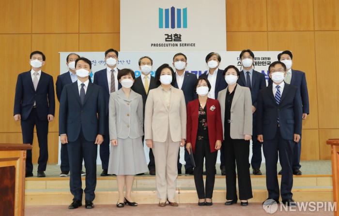 [서울=뉴스핌] 백인혁 기자 = 23일 오후 서울 서초구 대검찰청에서 열린 제6차 상생조정위원회에서 박영선 중소벤처기업부 장관을 비롯한 참석자들이 기념촬영을 하고 있다. 2020.09.23 dlsgur9757@newspim.com