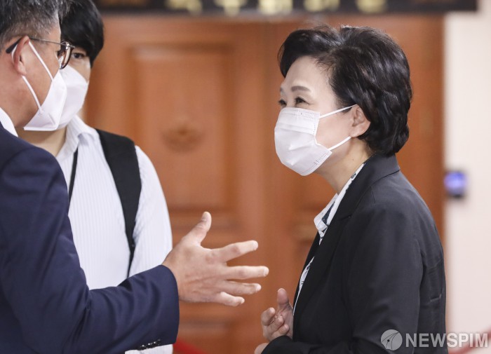 [서울=뉴스핌] 이한결 기자 = 김현미 국토교통부 장관이 24일 오전 서울 종로구 정부서울청사에서 열린 국정현안조정회의에 입장하기 전 관계자와 대화를 나누고 있다. 2020.09.24 alwaysame@newspim.com