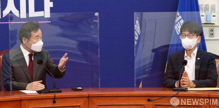 [서울=뉴스핌] 이형석 기자 = 박재민 국방부 차관이 24일 더불어민주당 국회 당대표실을 방문해 북한 해역 실종 선원 피격 사건에 대해 보고하고 있다. 2020.09.24 leehs@newspim.com