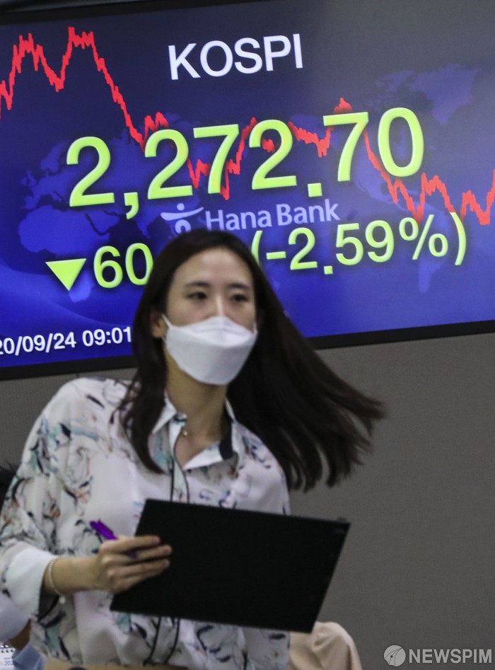 [서울=뉴스핌] 이한결 기자 = 24일 오후 코스피 지수가 전 거래일 대비 60.54포인트(2.59%) 내린 2,272.70에 마감했다. 코스닥 지수는 36.50포인트(4.33%) 내린 806.95에 장을 마쳤고 달러/원 환율은 8.3원 오른 1,172.7원에 종료했다. 이날 서울 중구 하나은행 딜링룸에서 딜러들이 업무를 보고 있다. 2020.09.24 alwaysame@newspim.com