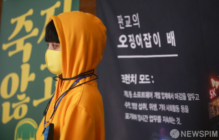 [서울=뉴스핌] 최상수 기자 = 류호정 정의당 의원이 28일 오전 서울 여의도 국회 로텐더홀에서 16일차 중대재해기업처벌법 제정 촉구 1인 시위에 나서고 있다. 2020.09.28 kilroy023@newspim.com