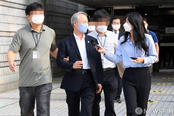 [서울=뉴스핌] 백인혁 기자 = 광복절 불법집회를 공모한 혐의를 받는 김수열 일파만파 대표(앞쪽)와 김경재 전 한국자유총연맹 총재가 28일 오후 서울 서초구 서울중앙지방법원에서 열린 구속 전 피의자 심문(영장실질심사)을 마친 뒤 호송차로 이동하고 있다. 2020.09.28 dlsgur9757@newspim.com