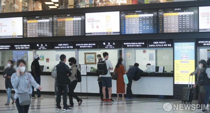[서울=뉴스핌] 이형석 기자 = 추석 연휴를 하루 앞둔 29일 오후 서울 서초구 고속버스터미널 매표소에서 시민들이 버스표를 구매하고 있다. 2020.09.29 leehs@newspim.com