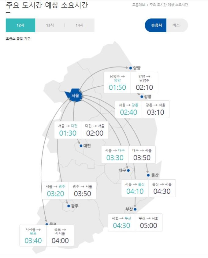 이날 12시 요금소 기준으로 승용차를 이용해 부산에서 서울까지 가는데 소요되는 시간은 5시간으로 예상된다. 이 밖 지역의 주요 도시간 예상 소요시간을 보면 ▲울산→서울(4시간 30분) ▲대구→서울(3시간 50분) ▲광주→서울(3시간 50분) ▲대전→서울(2시간) ▲목포→서서울(4시간) ▲강릉→서울 3시간 10분) 등이다.