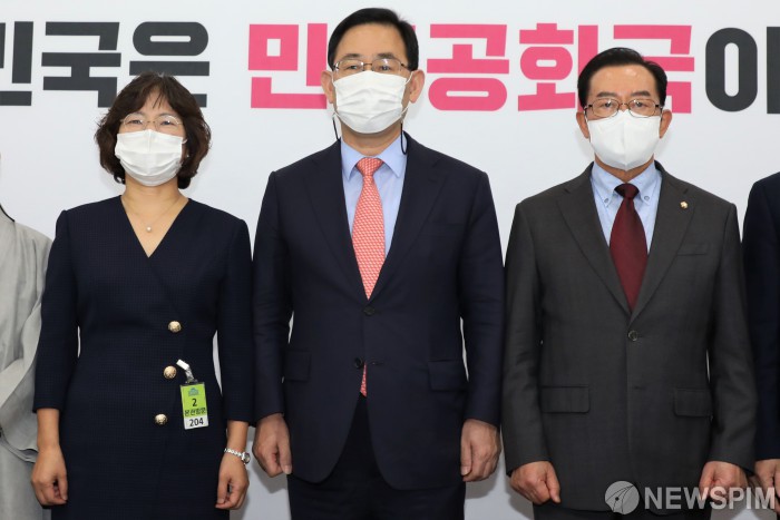 [서울=뉴스핌] 이형석 기자 = 주호영 국민의힘 원내대표(가운데)가 6일 오후 서울 여의도 국회에서 박노숙 한국노인종합복지관협회장(왼쪽)과 접견에 앞서 기념촬영을 하고 있다. 2020.10.06 leehs@newspim.com