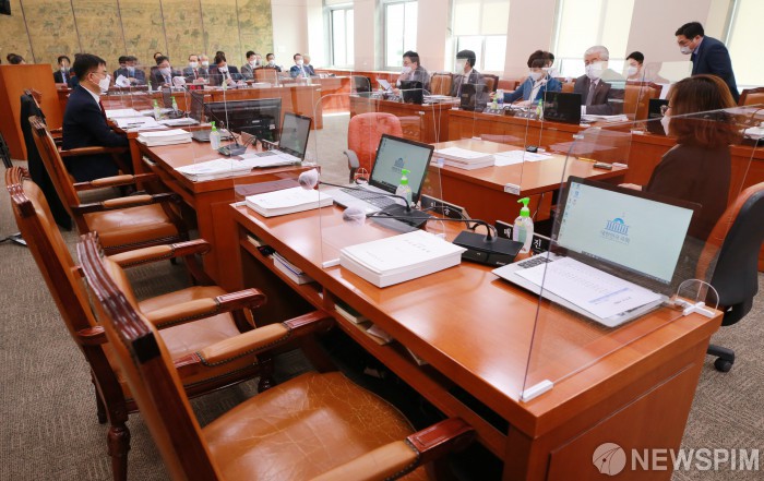 [서울=뉴스핌] 이형석 기자 = 7일 오전 서울 여의도 국회에서 문화체육관광위원회 국정감사가 열리고 있다. 국감장 내 참석인원을 50인으로 제한하기 위해 질의 순서가 뒤편에 위치한 의원들이 외부에서 대기하고 있다. 2020.10.07 leehs@newspim.com