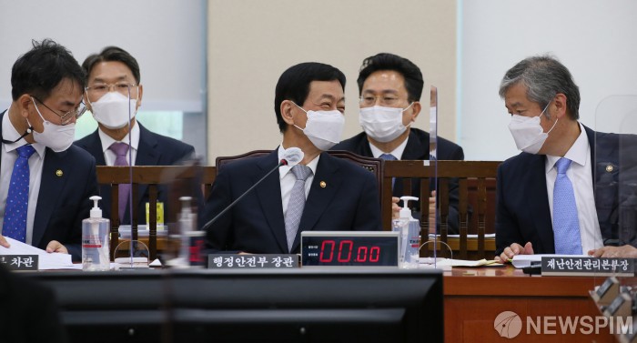 [서울=뉴스핌] 이형석 기자 = 진영 행정안전부 장관(가운데)이 7일 오전 서울 여의도 국회에서 열린 행정안전위원회의 행정안전부에 대한 국정감사에 출석해 김계조 재난안전관리본부장과 대화를 나누고 있다. 2020.10.07 leehs@newspim.com