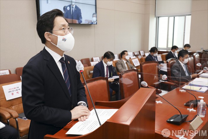 [서울=뉴스핌] 이형석 기자 = 성윤모 산업통상자원부 장관이 7일 오전 서울 여의도 국회에서 열린 국회 산업통상자원중소벤처기업위원회의 산업통상자원부에 대한 2020년 국정감사에서 업무보고를 하고 있다. 2020.10.07 leehs@newspim.com