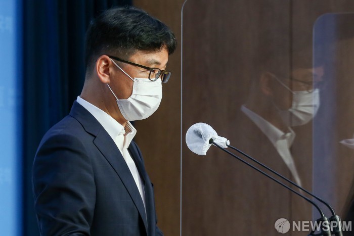 [서울=뉴스핌] 최상수 기자 = 이복우 국회 공보기획관이 8일 오전 서울 여의도 국회 소통관에서 ‘삼성전자 간부 출입기자증 발급 관련 국회 사무총장 입장문’을 발표하고 있다. 2020.10.08 kilroy023@newspim.com