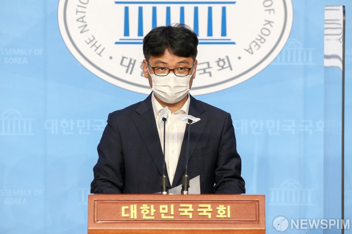 [서울=뉴스핌] 최상수 기자 = 이복우 국회 공보기획관이 8일 오전 서울 여의도 국회 소통관에서 ‘삼성전자 간부 출입기자증 발급 관련 국회 사무총장 입장문’을 발표하고 있다. 2020.10.08 kilroy023@newspim.com