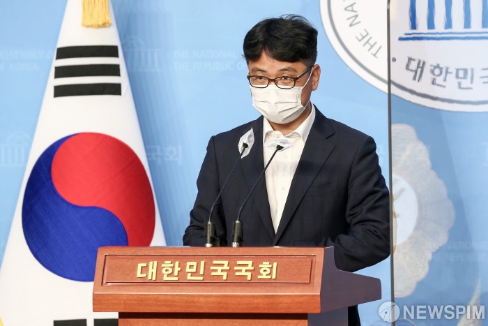 [서울=뉴스핌] 최상수 기자 = 이복우 국회 공보기획관이 8일 오전 서울 여의도 국회 소통관에서 ‘삼성전자 간부 출입기자증 발급 관련 국회 사무총장 입장문’을 발표하고 있다. 2020.10.08 kilroy023@newspim.com