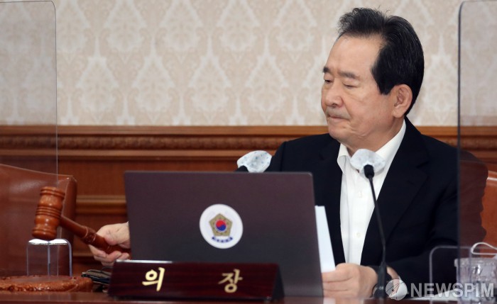 [서울=뉴스핌] 이한결 기자 = 정세균 국무총리가 13일 오전 서울 종로구 정부서울청사에서 열린 제52회 국무회의에서 의사봉을 두드리고 있다. 2020.10.13 alwaysame@newspim.com