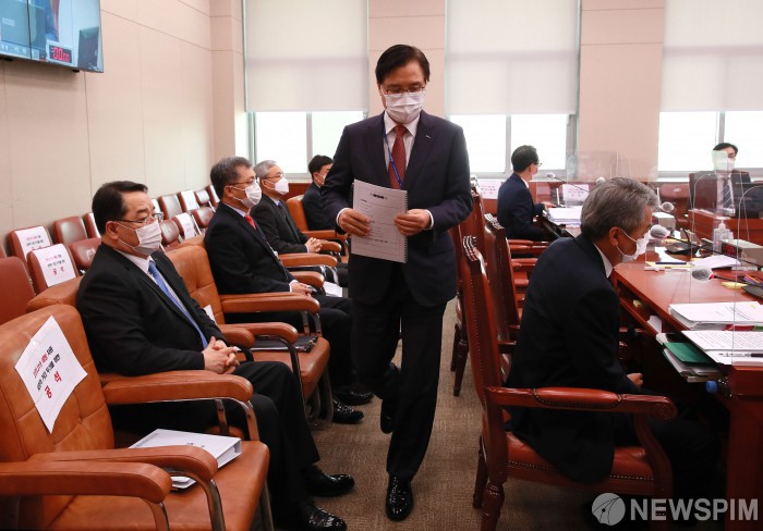 [서울=뉴스핌] 최상수 기자 = 권평오 대한무역투자진흥공사 사장이 13일 서울 여의도 국회에서 열린 산업통상자원중소벤처기업위원회의 대한무역투자진흥공사·한국무역보험공사 등에 대한 국정감사에서 업무보고를 위해 단상으로 향하고 있다. 2020.10.13 kilroy023@newspim.com