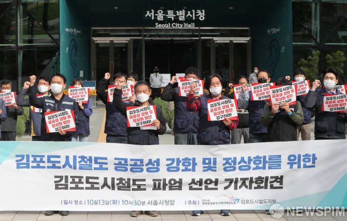 [서울=뉴스핌] 김학선 기자 = 민주노총 전국공공운수사회서비스노조 김포도시철도지부가 13일 오전 서울시청 앞에서 김포도시철도 공공성 강화 및 정상화를 위한 파업 선언 기자회견을 하고 있다. 2020.10.13 yooksa@newspim.com
