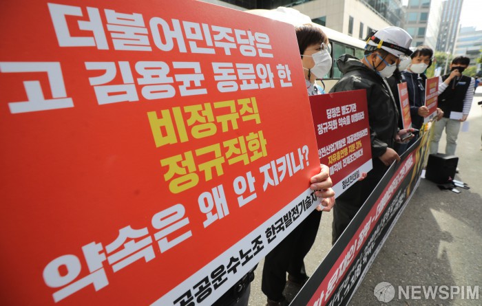 [서울=뉴스핌] 백인혁 기자 = 공공운수노조 한국발전기술지부, 청년전태일, 진보당 관계자들이 13일 오전 서울 여의도 더불어민주당사 앞에서 김용균 동료 기만한 문재인 정부-더불어민주당 규탄 기자회견을 하고 있다. 2020.10.13 dlsgur9757@newspim.com