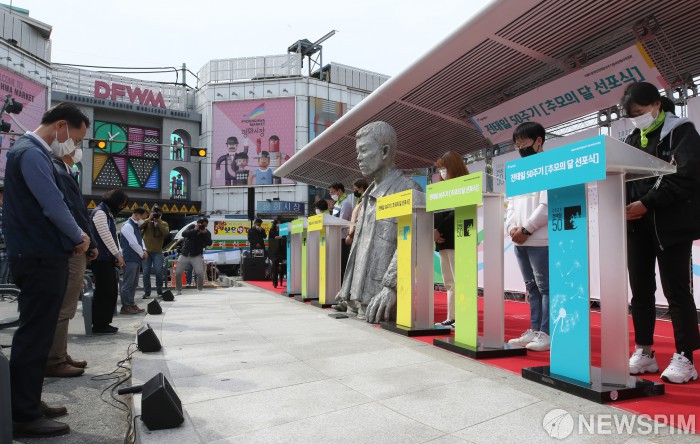 [서울=뉴스핌] 백인혁 기자 = 14일 오전 서울 종로구 청계천 전태일다리(버들다리)에서 열린 '전태일 50주기 추모의 달 선포식'에서 참석자들이 묵념을 하고 있다. 2020.10.14 dlsgur9757@newspim.com