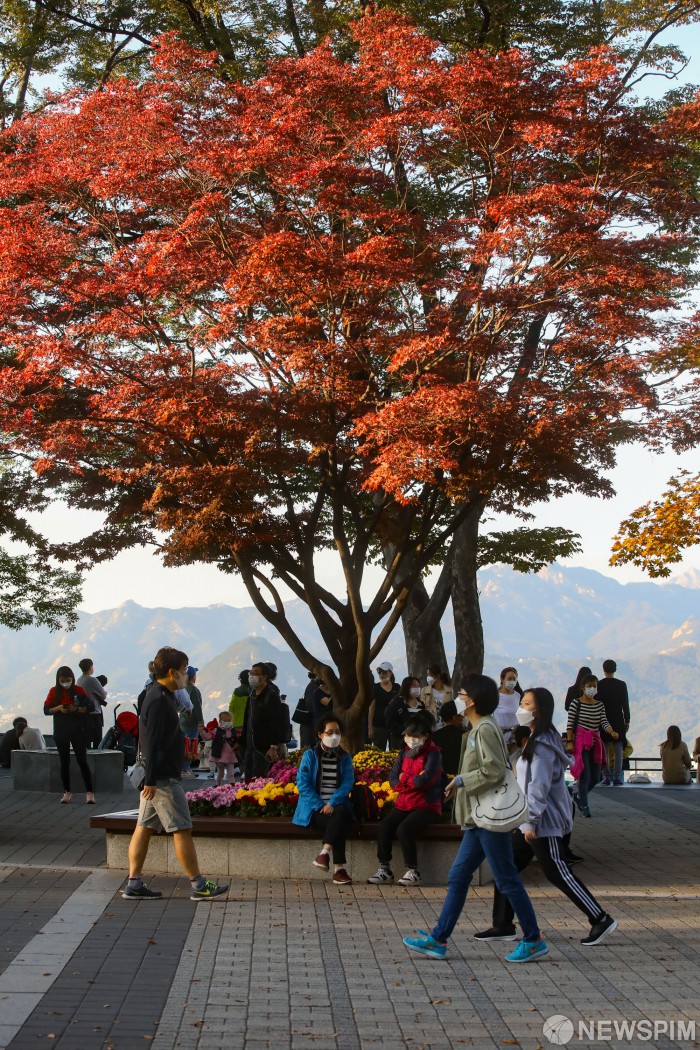 [서울=뉴스핌] 최상수 기자 = 17일 오후 서울 중구 남산타워에서 단풍이 물들어 가는 가운데 시민들이 가을 산책을 즐기고 있다. 정부는 단풍절정기인 이달 17일부터 다음달 15일까지 가을철 코로나19 방역 집중관리 기간에 들어간다고 밝혔다. 2020.10.17 kilroy023@newspim.com