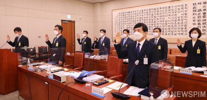 [서울=뉴스핌] 이한결 기자 = 조상철 서울고검장이 19일 오전 서울 여의도 국회 법제사법위원회에서 열린 국정감사에서 출석해 선서를 하고 있다. 조상철(앞줄 왼쪽부터) 서울고검장, 오인서 수원고검장, 이성윤 서울중앙지검장. 2020.10.19 alwaysame@newspim.com