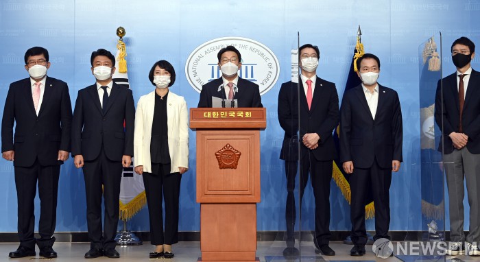 [서울=뉴스핌] 이형석 기자 = 권성동 국민의힘 라임-옵티머스 권력형 비리게이트 특위 위원장과 위원들이 20일 오전 서울 여의도 국회 정론관에서 검찰총장 수사 지휘권 배제 관련 기자회견을 하고 있다. 2020.10.20 leehs@newspim.com