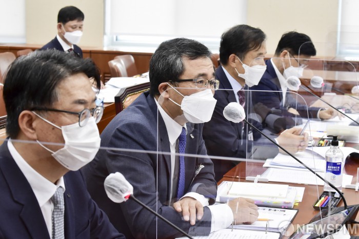 [서울=뉴스핌] 이형석 기자 = 문성유 캠코 사장(왼쪽 두번째)이 20일 서울 여의도 국회 정무위원회에서 열린 예금보험공사·한국자산관리공사·한국주택금융공사·한국예탁결제원 등 2020 국정감사에서 질의에 답변하고 있다. 2020.10.20 leehs@newspim.com