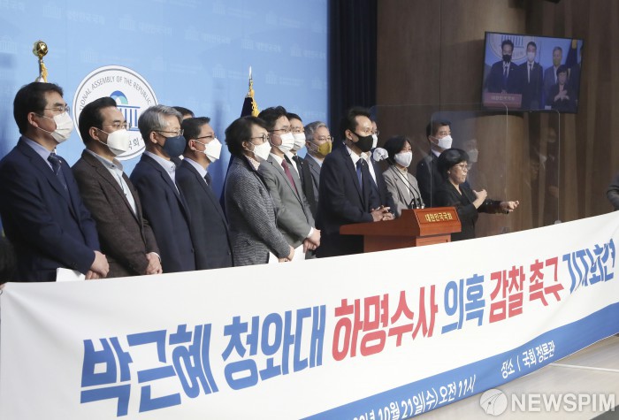[서울=뉴스핌] 이형석 기자 = 안민석 더불어민주당 의원이 21일 서울 여의도 국회 소통관에서 열린 박근혜 정권의 하명수사 의혹 감찰촉구 기자회견에서 모두발언을 하고 있다. 2020.10.21 leehs@newspim.com