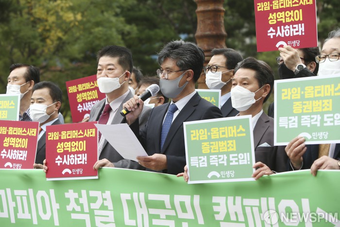 [서울=뉴스핌] 이형석 기자 = 이수봉 민생당 비대위원장이 21일 국회 앞에서 열린 라임·옵티머스 사태 진상규명을 촉구하는 기자회견에서 발언을 하고 있다. 2020.10.21 leehs@newspim.com