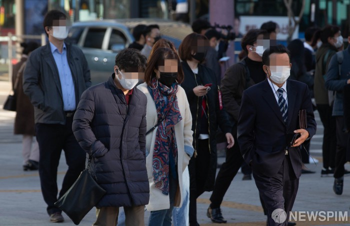 [서울=뉴스핌] 윤창빈 기자 = 절기상 서리가 내린다는 '상강(霜降)'인 23일 오전 서울 종로구 광화문광장 인근의 시민들이 추워진 날씨에 두꺼운 옷차림으로 출근길을 서두르고 있다. 2020.10.23 pangbin@newspim.com