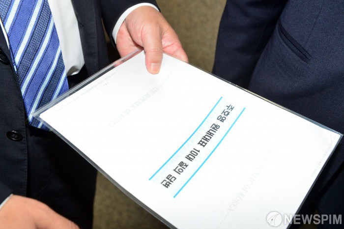 [서울=뉴스핌] 이형석 기자 = 주호영 국민의힘 원내대표 면담을 마친 최재성 청와대 정무수석이 26일 국회 더불어민주당 대표실 앞에서 주 원내대표에게 전달하려 했던 '주호영 원내대표 10대 질의 답변서'를 들고 있다. 당초 최재성 정무수석은 답변서를 여야 비공개 일정으로 전달하려 했으나 주호영 원내대표 측에서 일정을 공개로 전환해 답변서를 전달하지 못한 것으로 알려 졌다. 2020.10.26 leehs@newspim.com