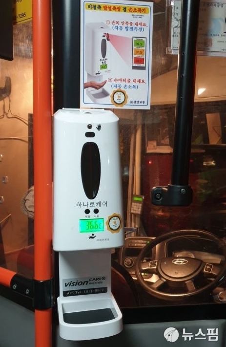 | 광양교통 시내버스에 설치된 (주)비즈케어 비접촉식 자동 발열측정 및 손소독 방역기기 [사진=비즈케어] 2020.10.26 wh7112@newspim.com |