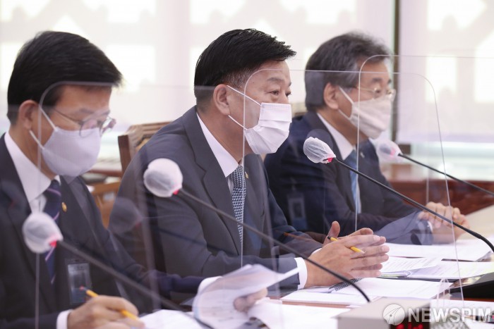 [서울=뉴스핌] 이형석 기자 = 김홍희 경찰청장(가운데)이 26일 국회 해양수산위원회의에 출석해 공무원 피격 사건에 대한 의원 질의에 답변하고 있다 .왼쪽부터 문성혁 해양수산부 장관. 김 청장, 김웅서 한국해양과학기술원장. 2020.10.26 leehs@newspim.com