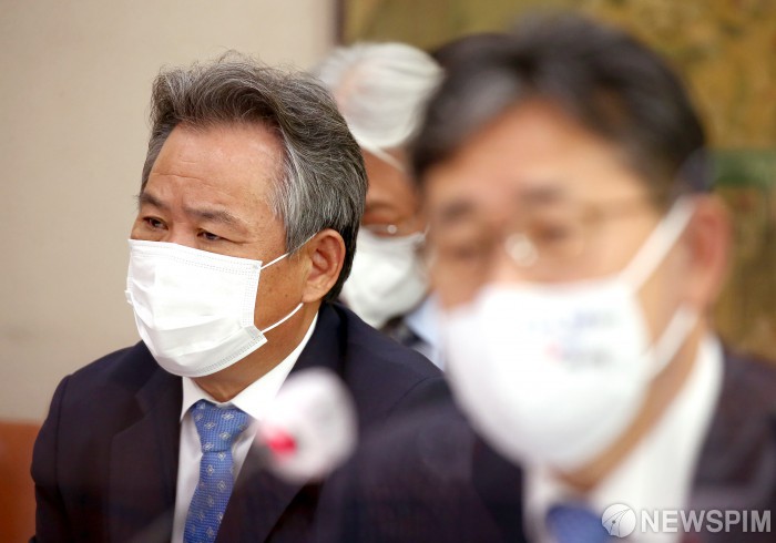 [서울=뉴스핌] 이형석 기자 = 이기흥 대한체육협회 회장(왼쪽)이 26일 국회 문화체육관광위워회 전체회의실에서 열린 종합국정감사에 출석해 의원들 질의를 듣고 있다. 2020.10.26 leehs@newspim.com