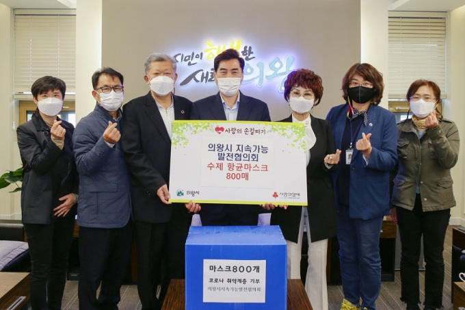 [의왕=뉴스핌] 박승봉 기자 = 경기 의왕시 지속가능발전협의회는 지난 26일 코로나19로 어려움을 겪고 있는 저소득층 및 사회복지시설에 전해달라며 손수 제작한 항균마스크 800매를 시에 기탁했다.