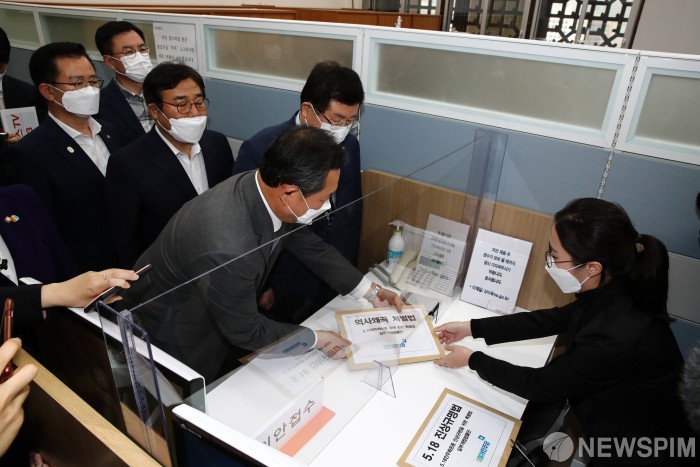 [서울=뉴스핌] 최상수 기자 = 설훈, 이현석 더불어민주당 의원 등 광주지역 국회의원 8명이 27일 오후 더불어민주당 당론으로 채택된 '5.18 관련법'을 국회 의안과에 제출하고 있다. 2020.10.27 kilroy023@newspim.com